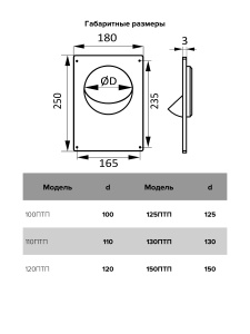 Для присоединения круглых воздуховодов соответствующего диаметра к выходу вентиляционной системы и его декоративного оформления. Монтаж к поверхности при помощи саморезов. Имеют девиатор для предотвращения обратного потока.
