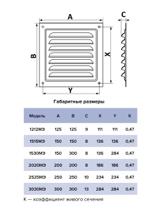 Решетка МЭ изготавливается из оцинкованной стали, которая покрывается полимерной эмалью. Имеет наклонные жалюзи. Оснащена антимоскитной сеткой, которая монтируется в специальном углублении, что упрощает процесс ее замены. Выпускается в базовом белом, а также следующих цветах: Brown, Gray, Black и Ivory.